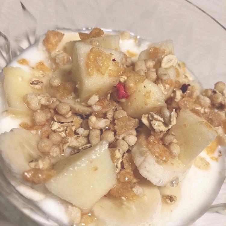 おは ⁽⁽ଘ( ˙꒳˙ )ଓ⁾⁾ 最近ハマってるヨーグルトが 美味しすぎるからみんなにも共有🥰 《作り方》 ①りんごを小さめの一口大に切る ②バナナを薄くスライス ③ ①②をヨーグルトと混ぜる ④フルグラとハチミツをかけて完成! めちゃくちゃ簡単だけど お腹いっぱいになるし 甘くて美味しいからおすすめ! 朝ご飯か夜ご飯として食べることが多いよ◎ お試しあれ〜❤︎(7)