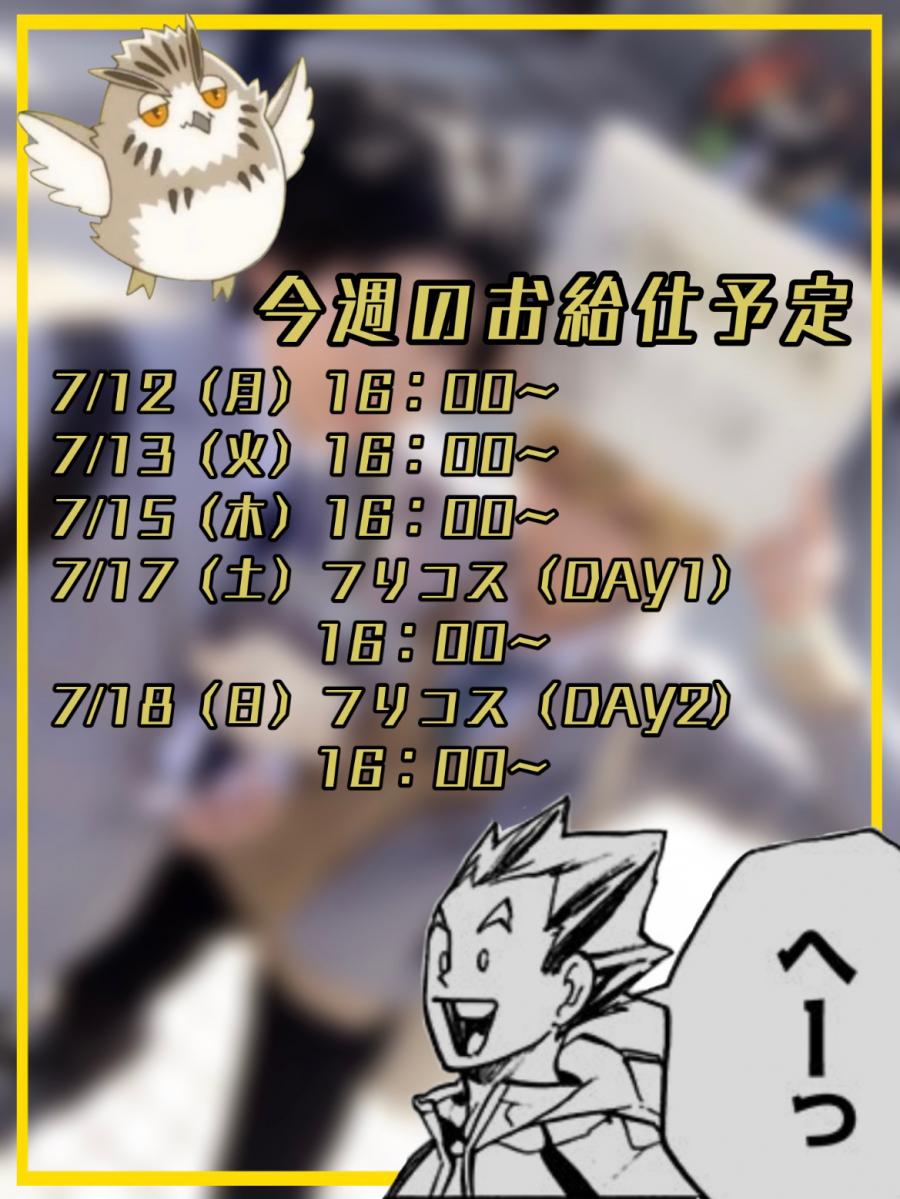 今週のお給仕予定!🗓🖋 フリコス両日出ます!まだ何やるか決めてません!あせあせ 今週も清瀬店にてお待ちしておりますので、自分の体調第一優先でよければくれあに愛に来てクレクレ〜🙏💕 。*⑅୨୧ おまけ ୨୧⑅*。 今回のくれあのちょこっと歌ってみたは「夜明けと蛍」をアカペラで🎵 ⚠️音量注意(0)