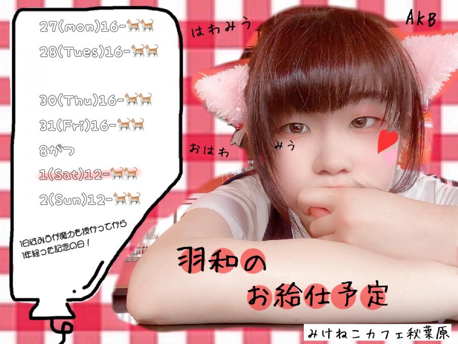 #はわのお給仕予定 来週めちゃくちゃいるのでたくさん会えちゃうんだよ〜✌️ そして8月1日は私が魔力を授かりみけねこカフェにきて1年経った記念の日です! お祝いしてくれたら嬉しいな〜って気持ち!(0)