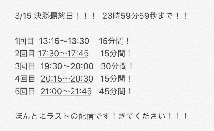 配信ラスト枠!終わりました!!!! みなさん本当にありがとうございました。 文では伝えきれないくらいです。 思いは後ほどお手紙に書きます! 配信来てくれた方本当にありがとう! 23時59分59秒まで、ぜひ応援お願いします! ラストスパートまだまだ頑張るぞ!!!!(8)
