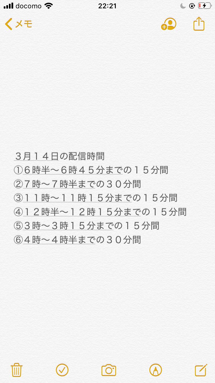 3月14日の配信時間です!! 最終日前日となります。 17時〜23時までバイトなので その間良かったら投稿に沢山CHEER待ってます。(0)