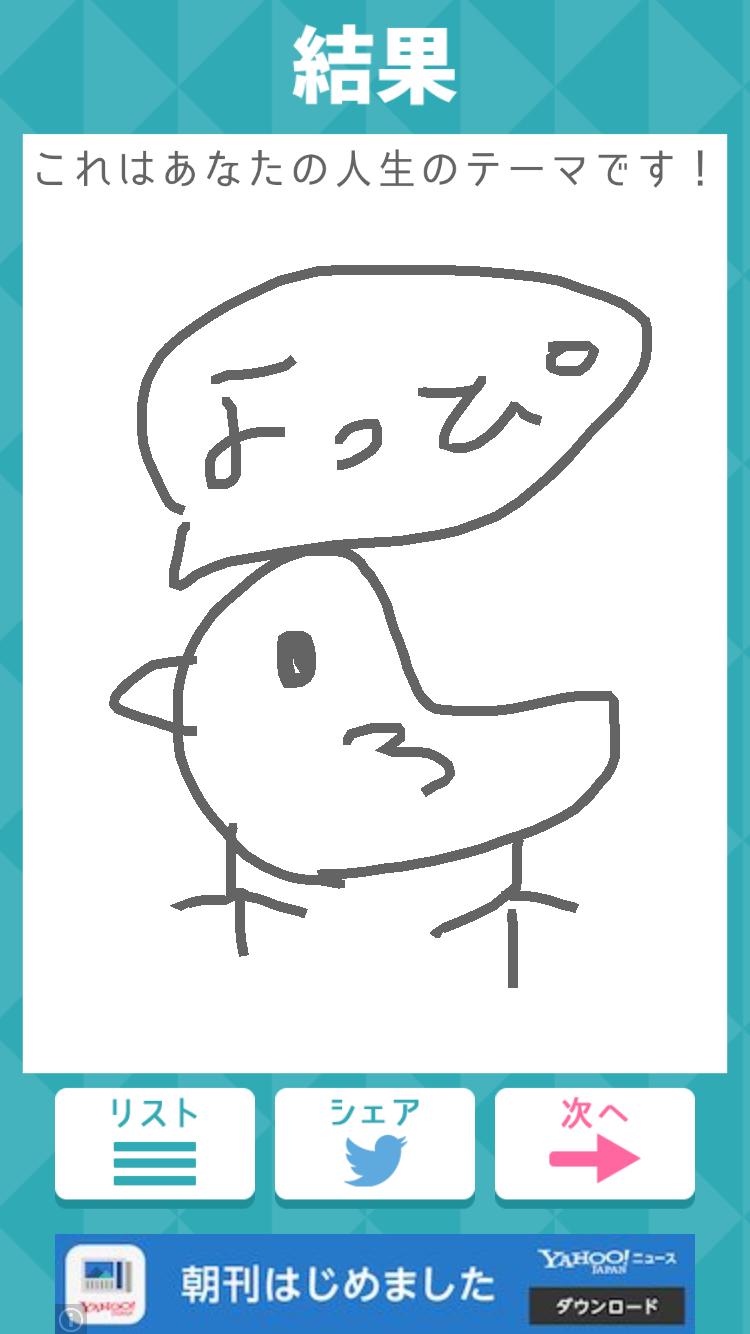 鳥と鳥がゆう言葉描いてくださいで書いたらその心理テストの結果、人生テーマとかでてよっぴってなんだよってね笑笑(0)