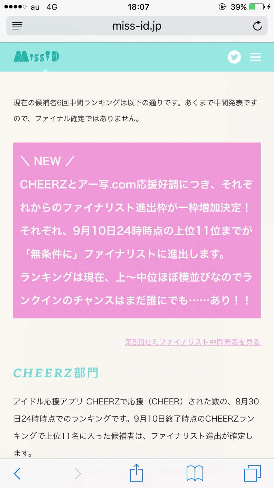 このタイミングで、選考内容が変わりました。 ベスト10ではなく11位までが選出されるみたいです。 今回はチアーズ、アー写共に10位でしたが チアーズは現在時点では11位です。 圏外だったはずが、どちらもファイナリスト圏内 ということになりました! この審査内容変更がわたしにとって吉と出るか凶と出るかはのこりの9日しだいです。 11位以内と言わず、1位でも上で上がりたいので わたしもまだアー写買うしiTunesカードも買います。 課金できなくてもいろんな友達とかにお声かけしてくれたらとても嬉しい(0)