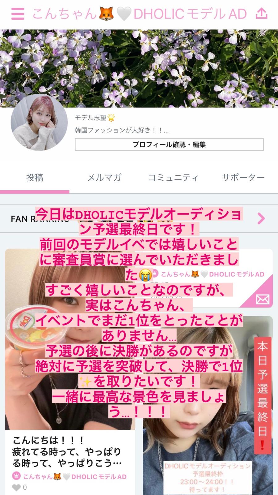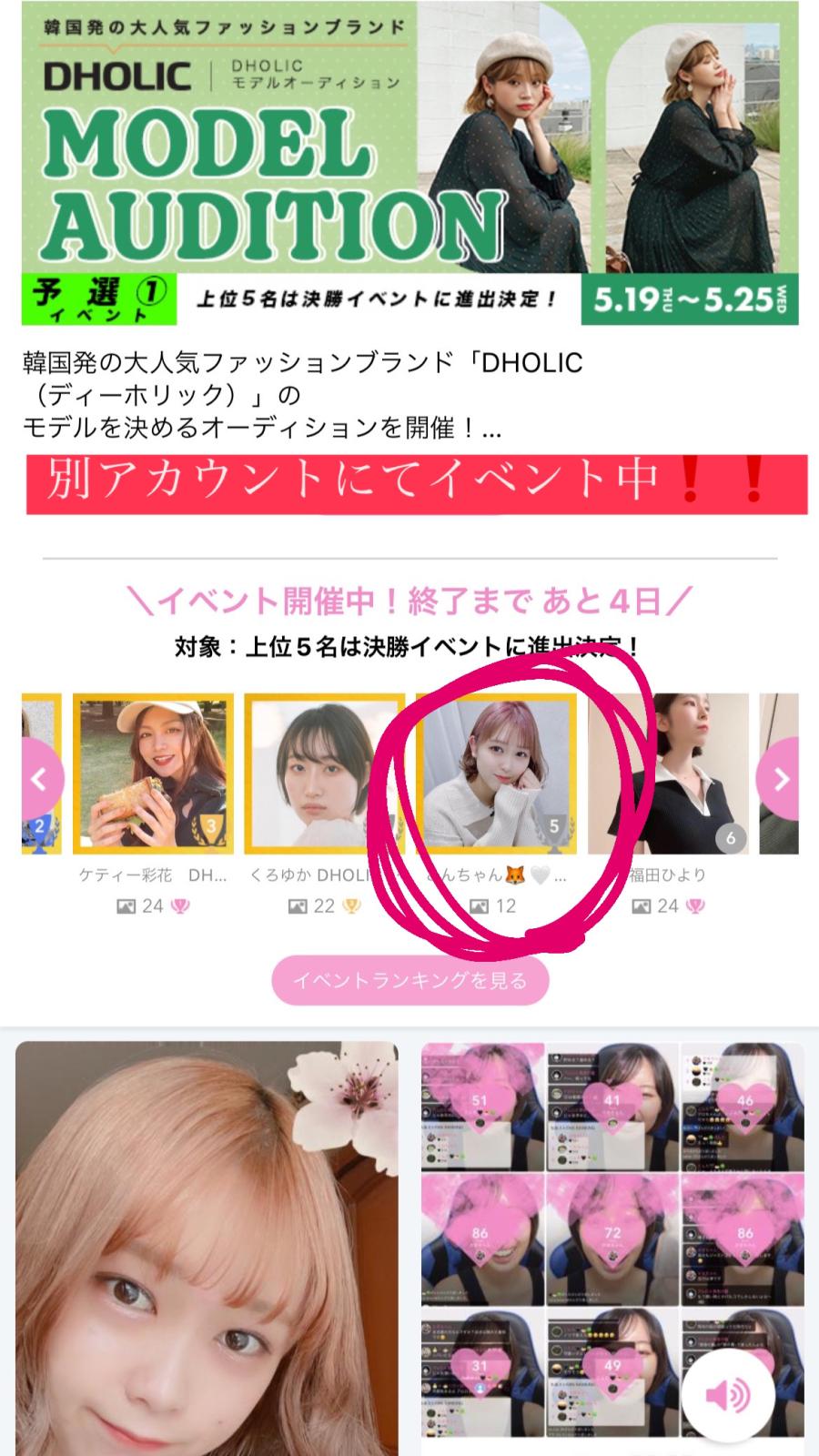 【イベント参加中のお知らせ】 知っている方も多いと思いますが! DHOLICモデルオーディションの予選に参加しています!! 皆様のおかげで現在5位に食い込めてます😭🤍 ありがとう… 決勝1位目指してがんばるので、応援お願いします! 配信は、よる23:00より開始します!!!(1)
