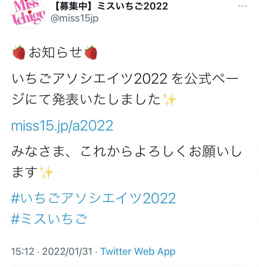 みなさんこんばんは! 昨日、いちごアソシエイツ2022のメンバーが公開になりました!こんちゃんは1ページ目の下の方に載ってるよ!これも皆さんが応援してくださったおかげです😭 ぜひチェックして拡散してください🤍 https://www.miss15.jp/a2022(1)