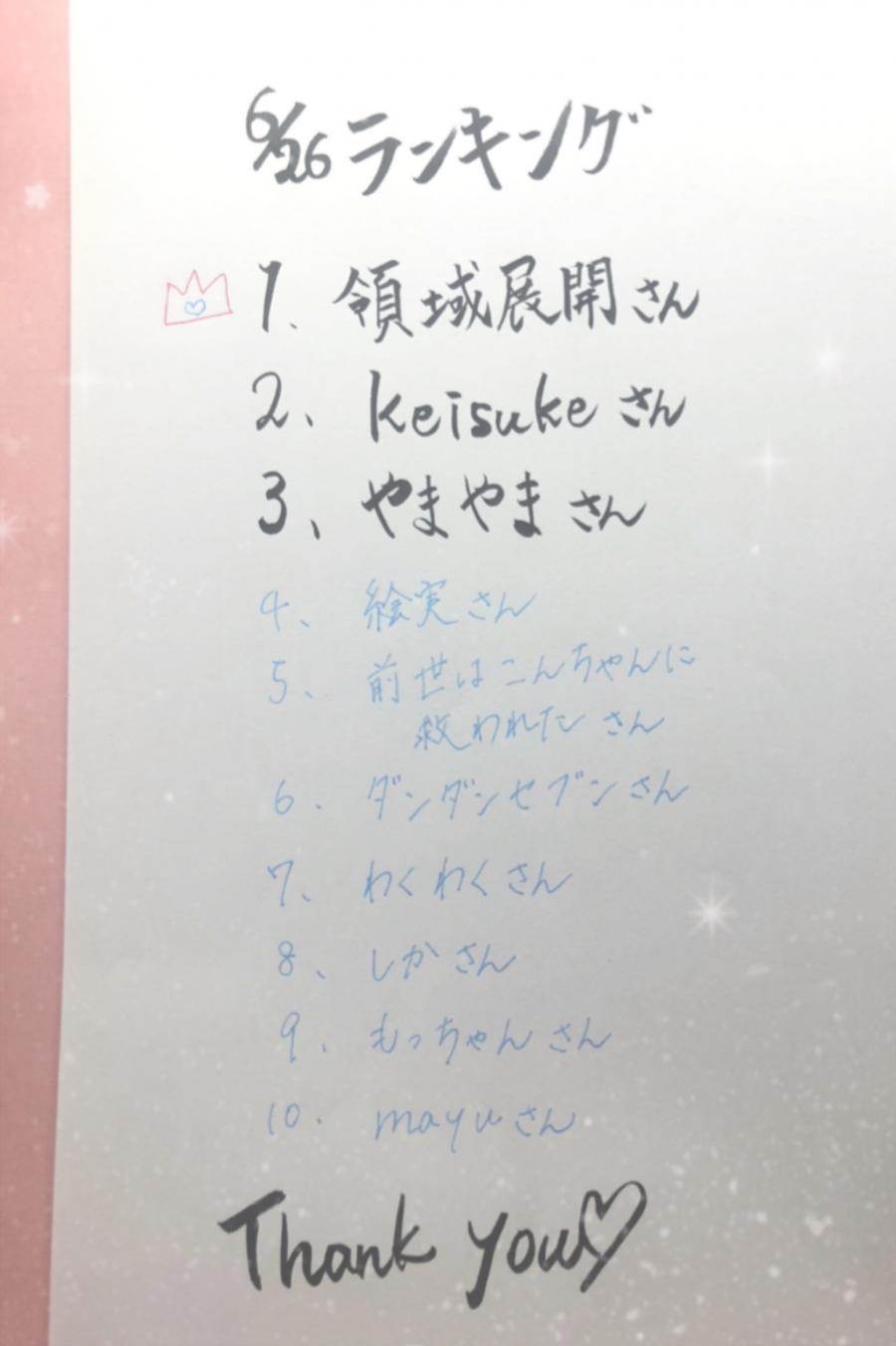 今日のファンランキングです!! ここに載ってる人ものってない人もみーんな大好きです!たくさんチアありがとう😭🤍 チアもらうたびに泣きそうになる😭😭 画像は、さっき筆ペン液出しすぎて、べちょべちょすぎて3位の方までしか書けなかった😭😭 ごめんね😭 初めての青ボールぺン!笑 ちなみに…ボイスでは初告白?? してみたので聞いてほしいなあ🤍(6)