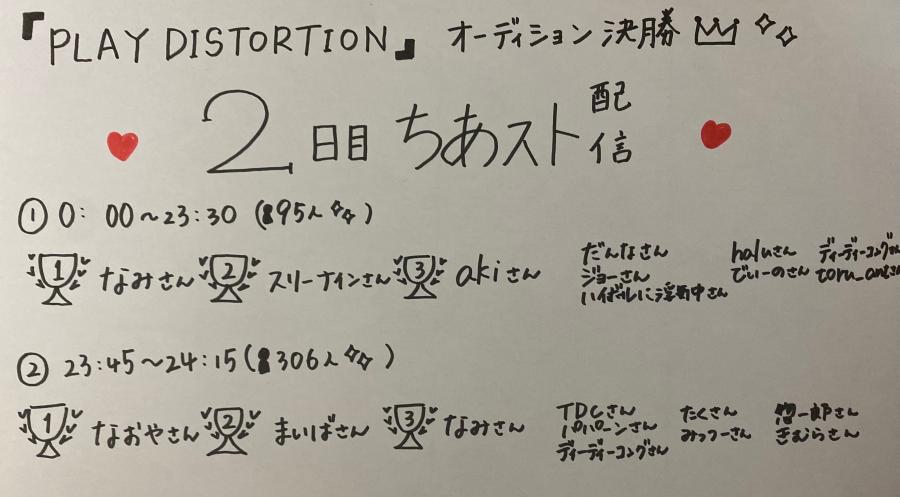 オーディション2日目ぶりの配信ありがとうございました!久しぶりに話せてより元気いっぱいになりました🌱 そして配信で「15秒お絵描き企画」しました❣️ 見ずに書いたのでなかなか難しかった😂😂 へんてこりんですが、とっても楽しかったです😂 4日目の配信も企画配信やっていこうと思ってます💪🏻 是非遊びにきてください💐 4日目も沢山の応援ありがとうございました! 現在4位!残り2日間、最後まで全力で!楽しむ! 1位の目標最後まで諦めません🔥🔥!! おやすみなさい🌛.☆*(1)