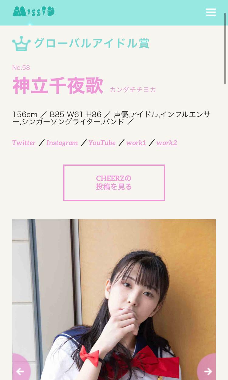 ご報告的な何か 長い間投稿/配信出来てなくてごめんなさい! お陰様で、ミスiDグローバルアイドル賞頂きました!皆さん長い間応援本当にありがとうございました♡ 皆さんのチアチアに励まされ、「私は私であっていいんだ」と思えるようになりました。 これからは、職業ライブアイドルを目指して新しいスタートを切りたいと思います。 CHEERZのアカウント・投稿は消しませんが、新しい投稿をする予定もありません。CHEERZは私にとって自分を初めて満足に表現出来た特別な場所で、ミスiDのストーリーを描けた場所(2)