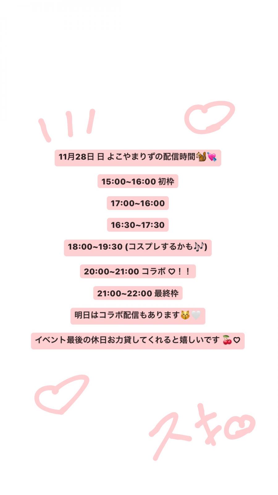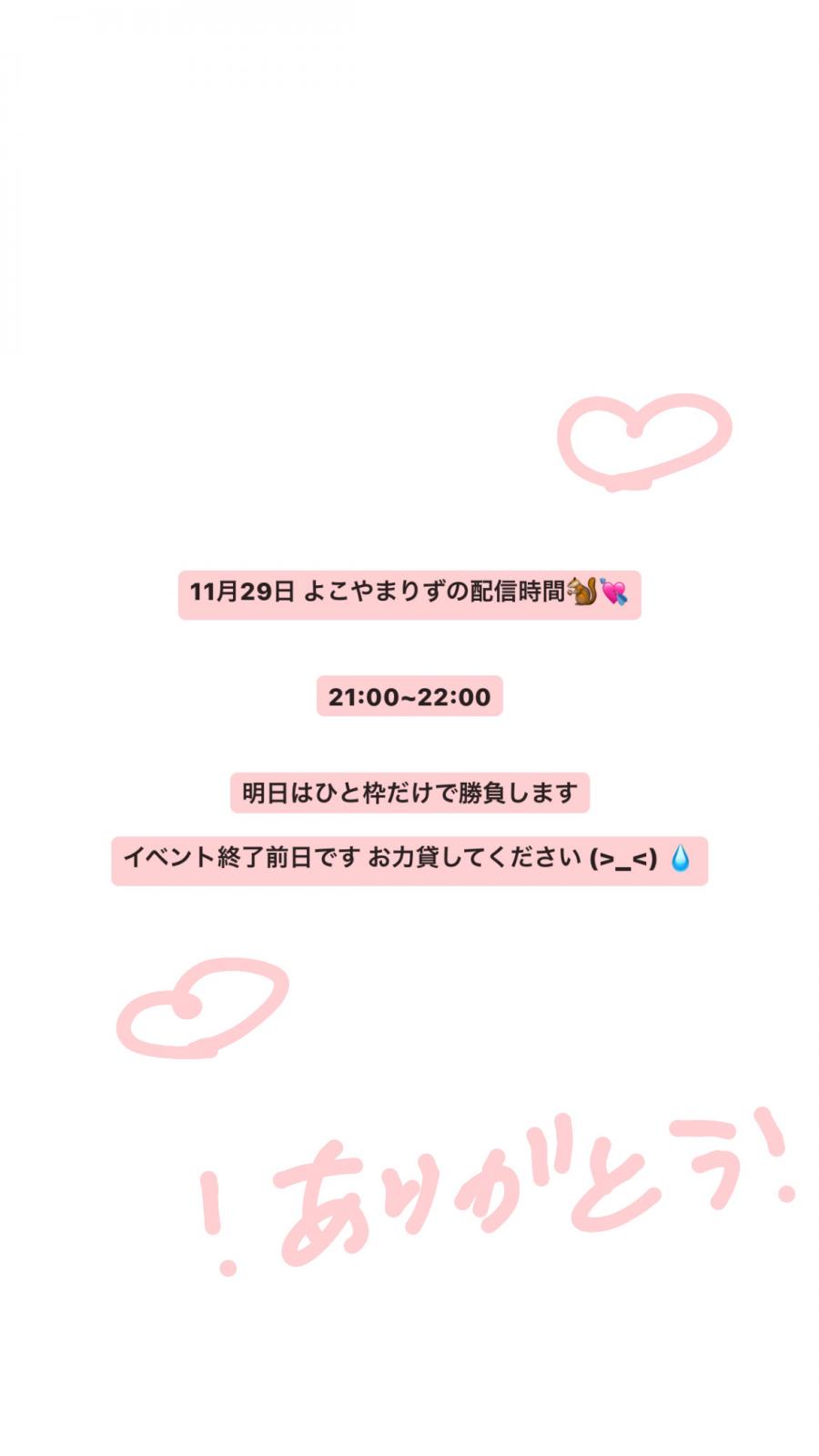 こんにちは☀️よこやまりずです🐿💘 今日で予選イベントが終わりです😭 スタートダッシュイベントから今日まで、約20日間ほど沢山の応援をありがとうございます🥰 スタダで一位を取らせてもらったので予選も1位で通過したいです。最後まで諦めず頑張るので良かったらお力貸してくれると嬉しいです😿 昨日は配信が1回も出来んかったんじゃけど皆さんが投稿に沢山チアしてくれたおかげでほんとに助かりました、ありがとう💭 今日は素晴らしいゲストを呼んでいるのでぜひ楽しみにしてください! りずは今から学校にいって(3)