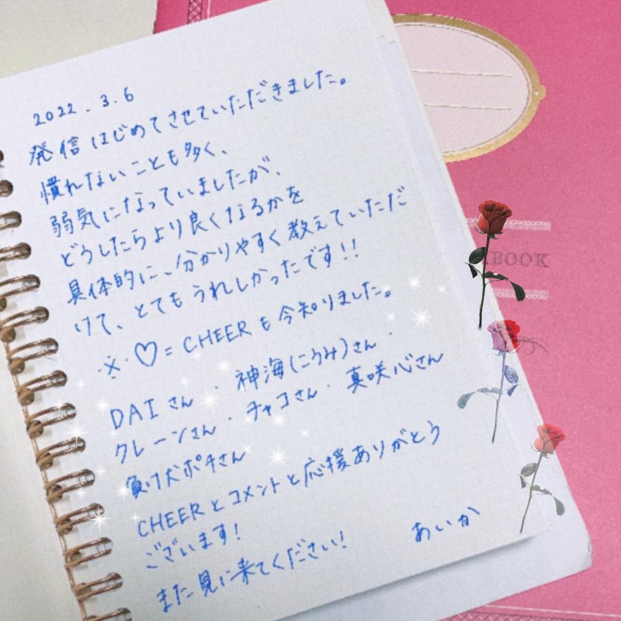 🌸今日も配信に来てくださりありがとうございました!🌸 18時から19時、 23時から0時 の配信も予定しています! また配信に遊びに来てください✨💐 今日の❤️CHEER❤️ありがとうございます! 顔面凶器さん こたろうさん 匠さん さんきち。さん 武蔵坊さん 小太郎さんbさん やまもと2ndさん 明朗会計さん 私のライブをコメントや会話を膨らませるサポートや盛り上げがとても励みになりました。 またCHEERのポイントにより途中2位になることなどもありました。 本当にありがとうございます(0)