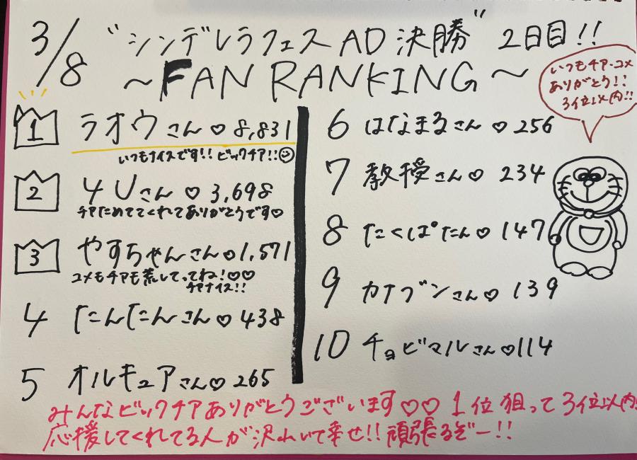 3/8のファンランキング!! みんな沢山チアありがとう😭😭💞 油断せずに頑張ります❤️🔥 下の動画は順位の変動がやばすぎて焦ってるんだけど、沢山チア貰えて幸せなのが混ざってるやつですね🥹💞(1)