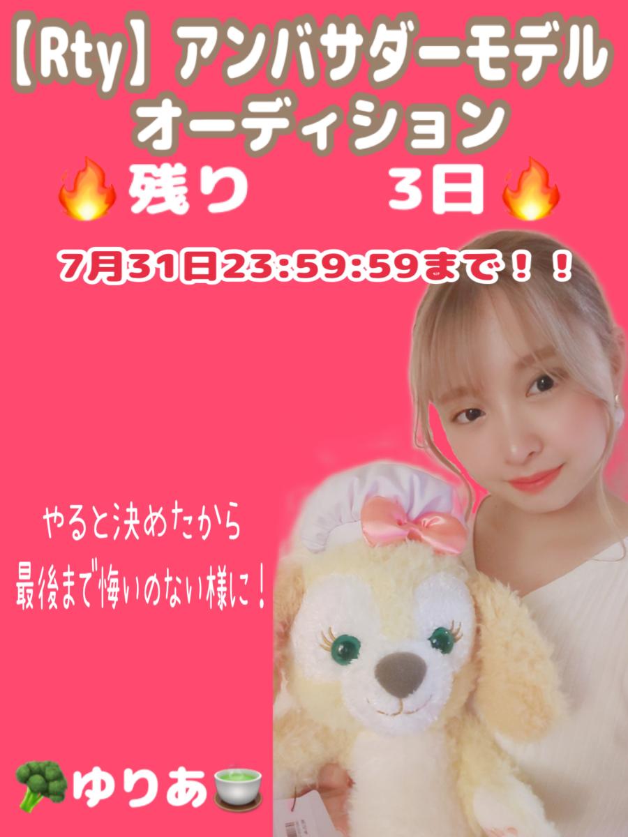 【Rty.】アンバサダーモデルADに参加してます❤️🔥 ゆりあです🥦🍵 残り2日間‼️ 応援してくださる皆さんの為にも最後まで💪🏻 お気に入り登録・CHEER・応援よろしくお願いします💕 🔥イベント期間🔥 7/22(金)20:00:00〜7/31(日)23:59:59 (上位1名Rty.アンバサダーモデルが決定!!) ⚠️本戦のみのオーディションになります。 🥦ゆりあのInstagram🍵 「https://www.instagram.com/yu_m_62」 🥦ゆりあのT(0)