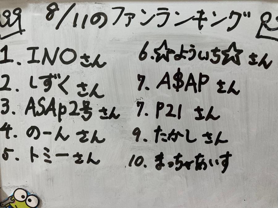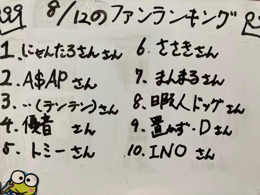 夜分遅くにごめんね😣🙏💦 11日のファンランキングです!! 夜中にしか配信できなかったにも関わらず来てくださってありがとうございました!配信できない間は投稿にチアくださりありがとうございました! 明日は1日空いてるので遅れを取り戻したいと思います!! もしかしたら浴衣配信するかもです! 🐸🤍(0)