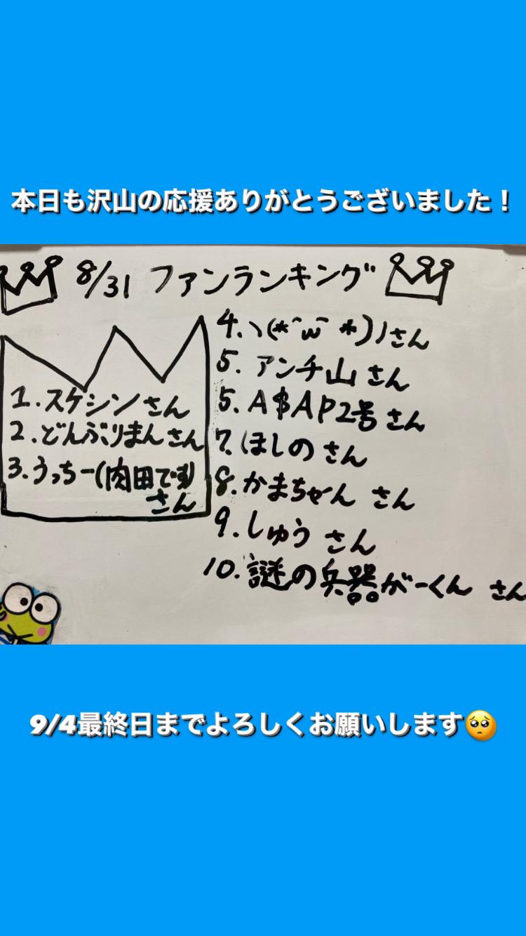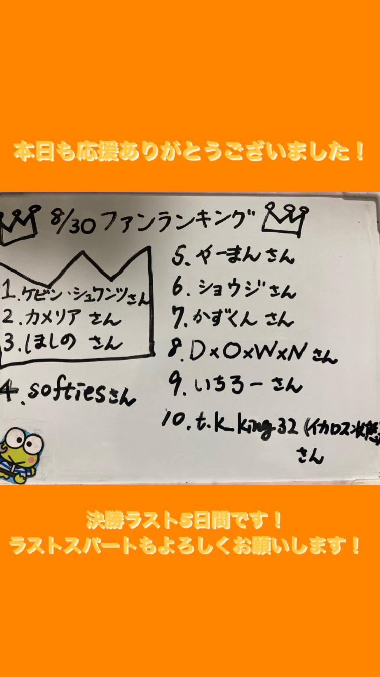 本日も沢山の応援ありがとうございました! ファンランキングです🙋♀️ 今日もたくさんの方が入室してくださり、お話しできて楽しかったです☺️ 特になぞなぞ配信では私は全く答えることができなかった🤦♂️ですが、みなさんとワイワイ楽しくお話出来て楽しかったです👏 みんな頭の回転早すぎ!! ミス浴衣ジェニック決勝も残り5日間となりました。2位との差も少しずつ縮まってきていてほんとにみなさんの応援に感謝しています。 そして楽しみながらもさらにラストスパート、2位以内と高みを目指して頑張っていき(0)