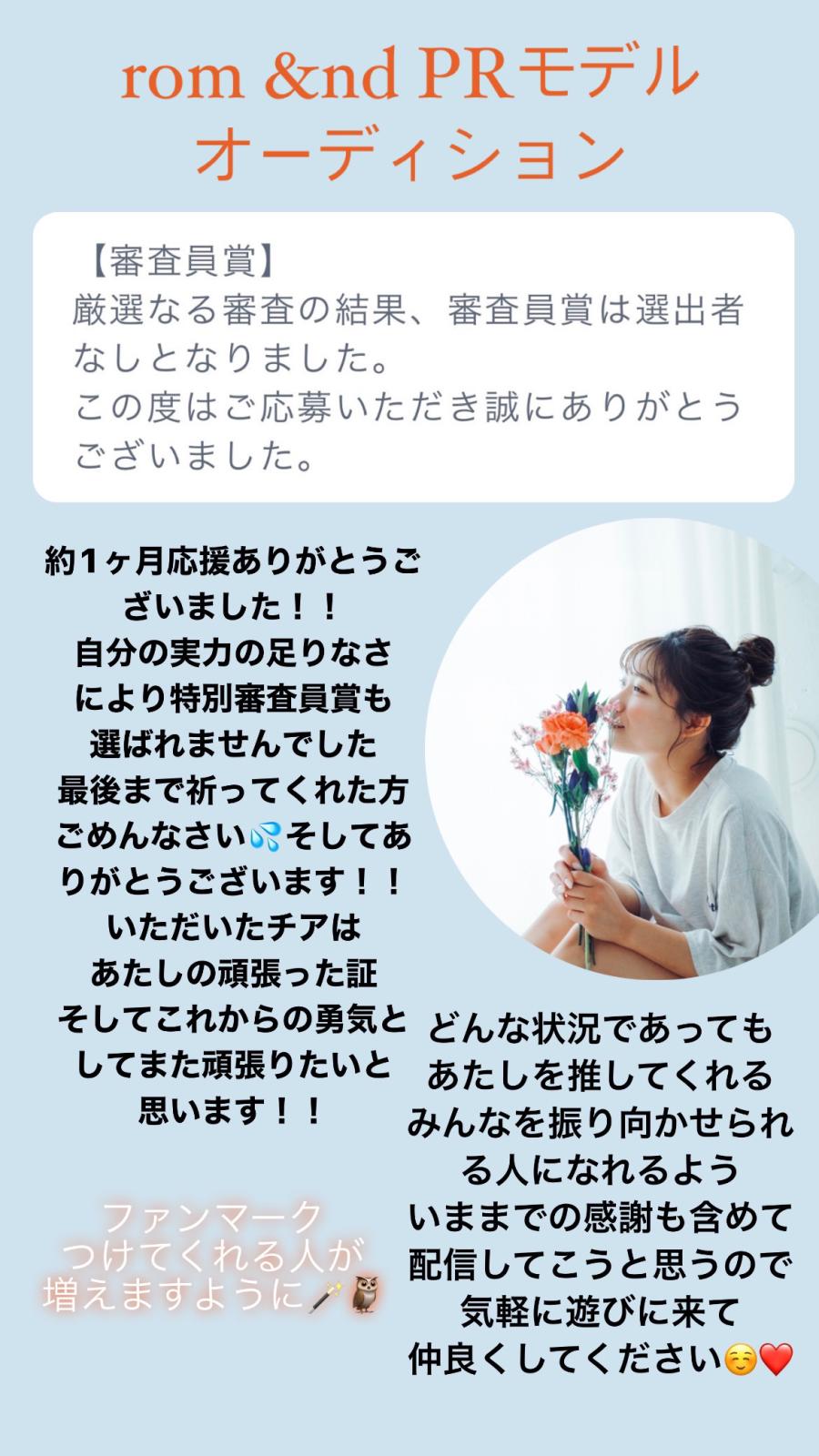連絡おそくなってごめんなさい💦 ロムアンドオーディションのお礼配信 本日21:30から1時間します!! 少しでも応援してくれたみなさん 集合です!! 自分の反省とこれからのこと みんなへの大感謝はなしてくううう 本当にありがとうございました🥺❤️(10)
