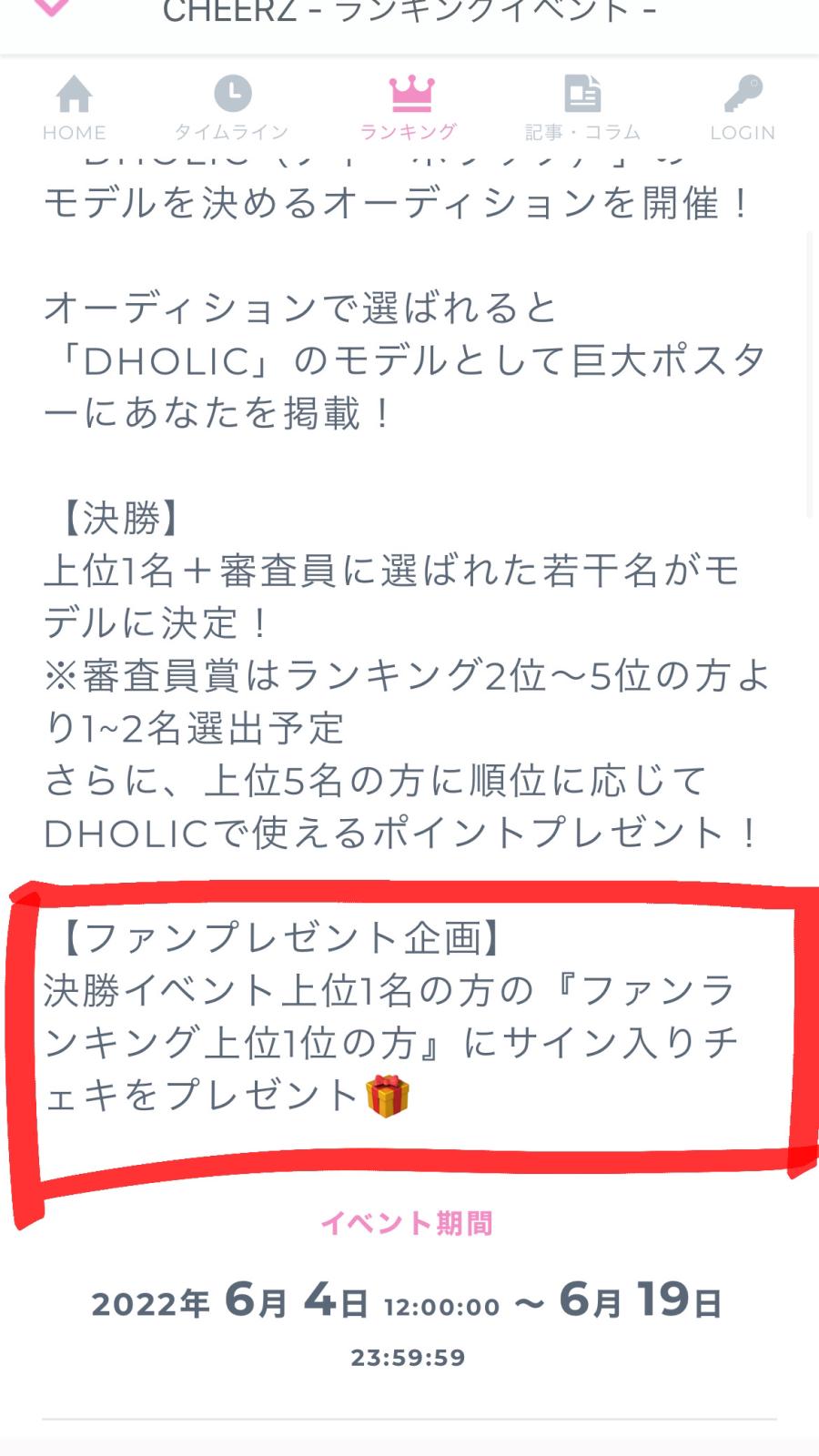 🎁DHOLICイベントファンプレゼント企画🎁 今回DHOLICイベントにてプレゼント企画があると 急遽決定致しました。 【DHOLICオーディション決勝上位1位の方の 『ファンランキング上位1位の方』に サイン入りチェキをプレゼント】とのことです。 1位になると信じているので ぜひゲットしちゃってください🥰 そもそもあたしのチェキ 欲しい人いるのかなあ、、笑🤔 しかもサインって!!笑 あたしそんなものないなあ笑 まぁまずは1位にならないとだね!笑 みんなで頑張ろう!😘 平日はなかな(2)