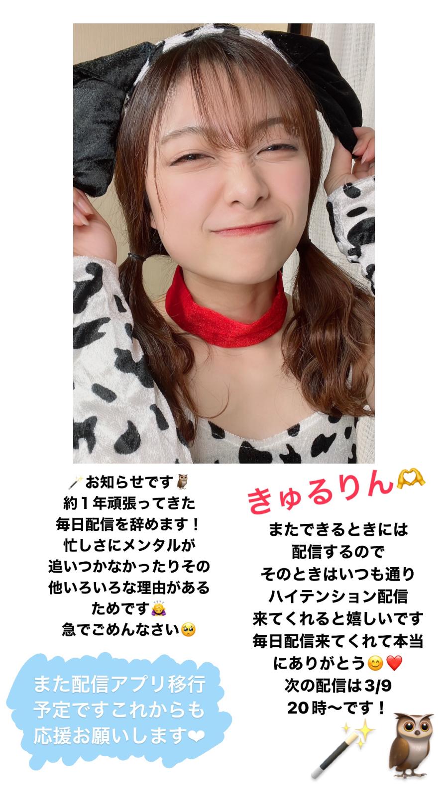 🪄お知らせです🦉 忙しさにメンタルが追いつかないため 毎日配信を辞めます! 急でごめんなさい🥺 でもできる時は配信するのできてね! 次の配信は明日の20時! またアプリ移行も考えています これからも応援お願いします!! それまでCHEERZでのオーディション 受けたいのがあればって感じです そのため引き続きポイント貯めて欲しいです🙇♀️ もしオーディションしなくてアプリ移行の場合は 卒業配信にて投げてくれると嬉しいです☺️ とりあえず明日配信します!! お仕事がんばろうね.°(ಗ(6)