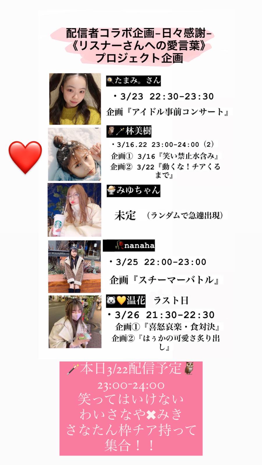 みんな久しぶりい!! 本日3/22 23:00-24:00久々配信します!🪄🦉 神戸ランウェイオーディション参加中の わいさなやとコラボです! 口に水を含んで笑ってはいけない企画します! 今回こそ大暴れします笑 ぱんすと、、、 チア持ってさなたん枠集合!❤️ また愛言葉のキーワード 部屋のどこかに隠すので見つけてね!! 自分の枠での配信はなしです! 待ってます😘(2)