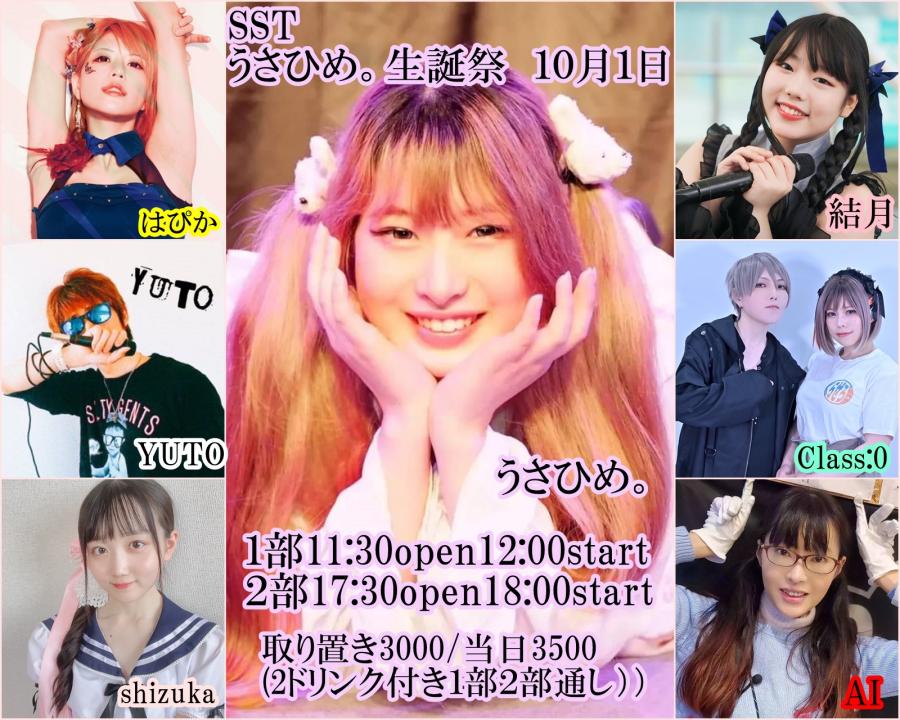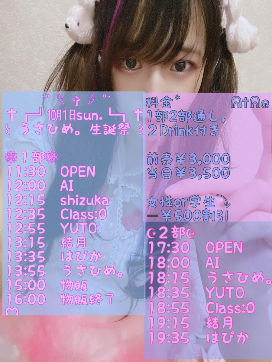 明日はいよいよ生誕 𓊆︎︎︎︎︎︎ うさひめ。生誕祭 𓊇 💍1♡月♡1曰💍*。 ꒰ঌ┈𝙾𝙿𝙴𝙽┈໒꒱ 11時~🌥“ ♔ 𝐂𝐋𝐎𝐒𝐄 ♔ ”21時頃 guest:SSTメンバー、SSTファミリー Class:0さん💙🧡shizukaちゃん🍓結月ちゃん🐱YUTOさん🕶 予約契約㌻▶︎ https://forms.gle/iN1n9TwnkAwW64S18 🎟.·料金(2Drink付き♠1部2部通し♠再入場◎) 前売¥3,000 当日¥3,500 女性or学生¥500引き 📸カメラ(0)