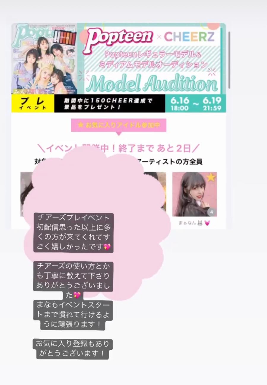 初めまして❣️popteenレギュラーモデルオーディションに参加のまぁなん🐰💓です! 高校3年生の17歳です✌️ 中学1年生からpopteenのモデルさんを目指して今年がラストチャンスです😖❣️ 全力で頑張ってレギュラーモデルになってみせるので応援してくれると嬉しいです🍀 今日からプレイベントがスタートですが、予選は 6月21日スタートなのでまだチアは温存しておいてもらえると嬉しいです♥(2)