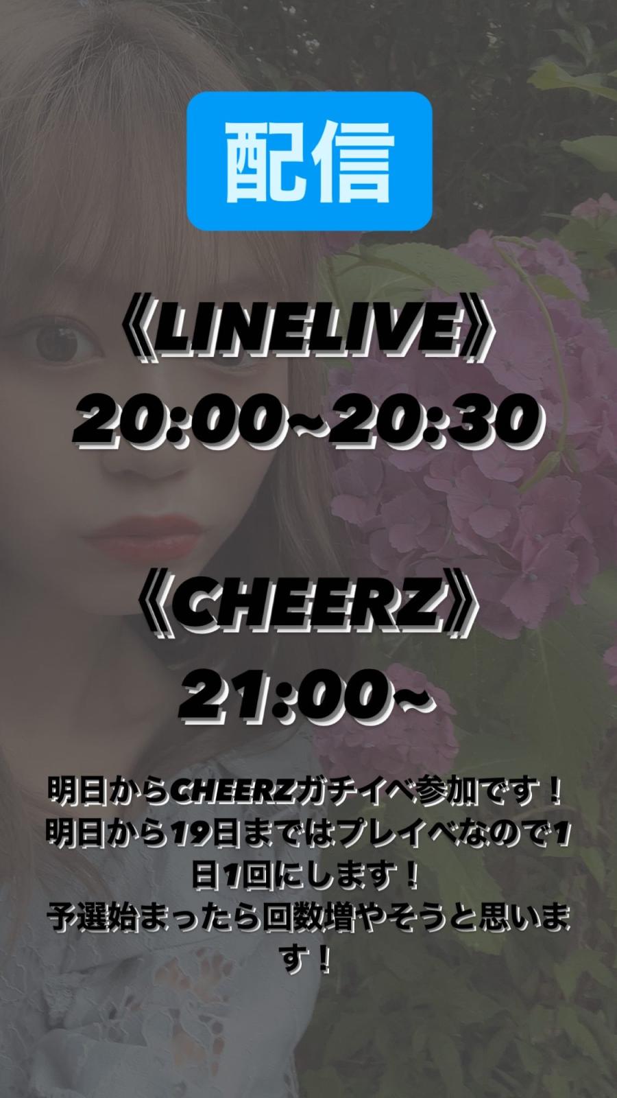 明日の配信時間とCHEERZ写真投稿時間です! 配信は明日から19日はプレイべなので1日1回にします。予選始まったら回数増やそうと思います‼️写真投稿はガチイベ中この時間は必ず投稿します!不定期で4つか5つになるかもです!(0)