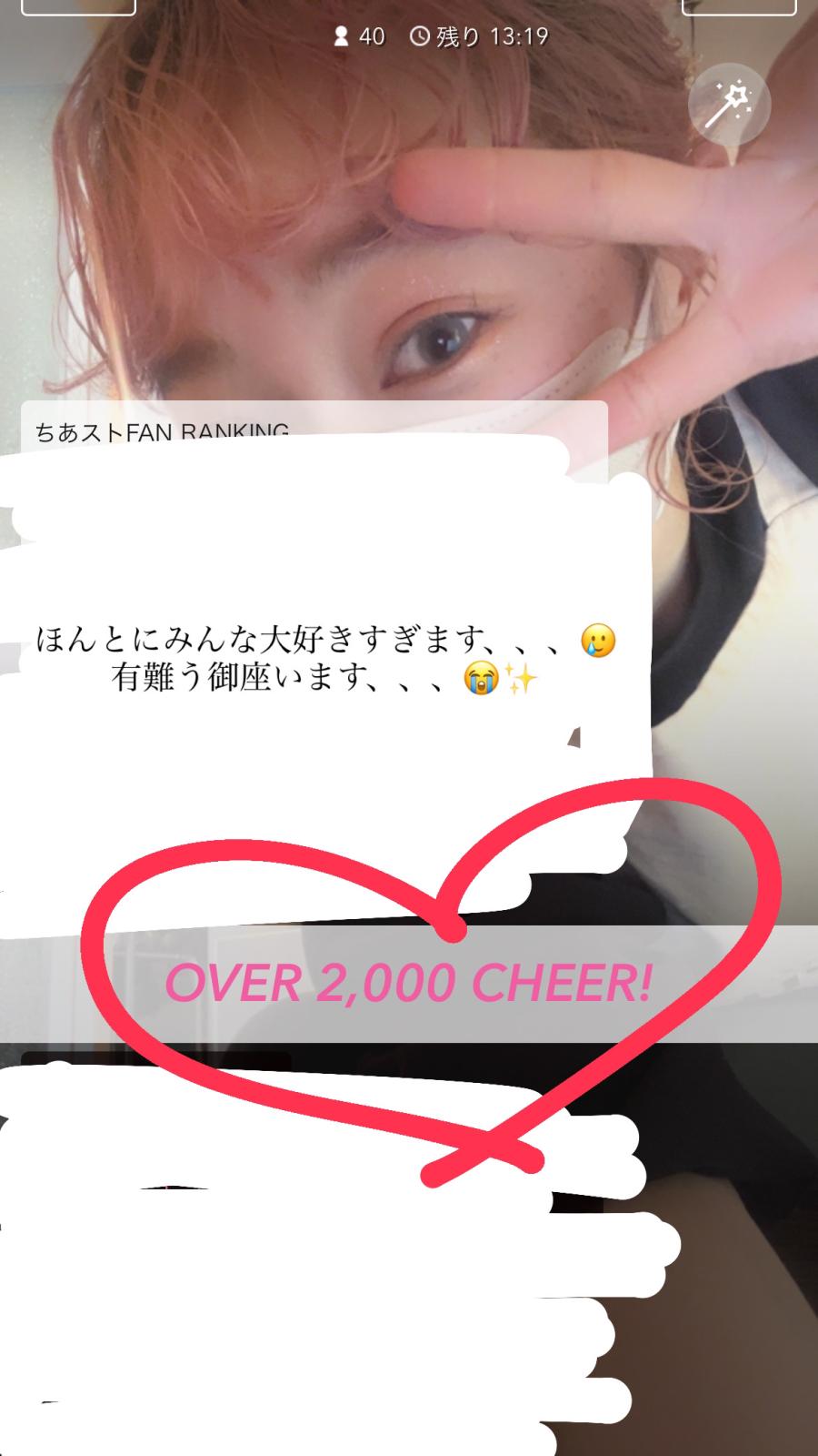 充電がないので取り急ぎ投稿で失礼致します、、、( ; ; ) めちゃくちゃ動揺してます沢山のチアーや入室本当に有難う御座います( ; ; ) もうちょっとどうしたらいいですか( ; ; )( ; ; ) 感謝しきれないです。💨💨 お昼の配信で初の2000チアーが嬉しくてスクリーンショットしたものです🥲♡ 興奮しすぎて3000チアーのスクリーンショットするの忘れてました🥲苦笑 悲しい!!!!! とにかくほんとに!!!!有難う御座います🥲 18:20くらいから配信もう一度したいと思います✨ (0)