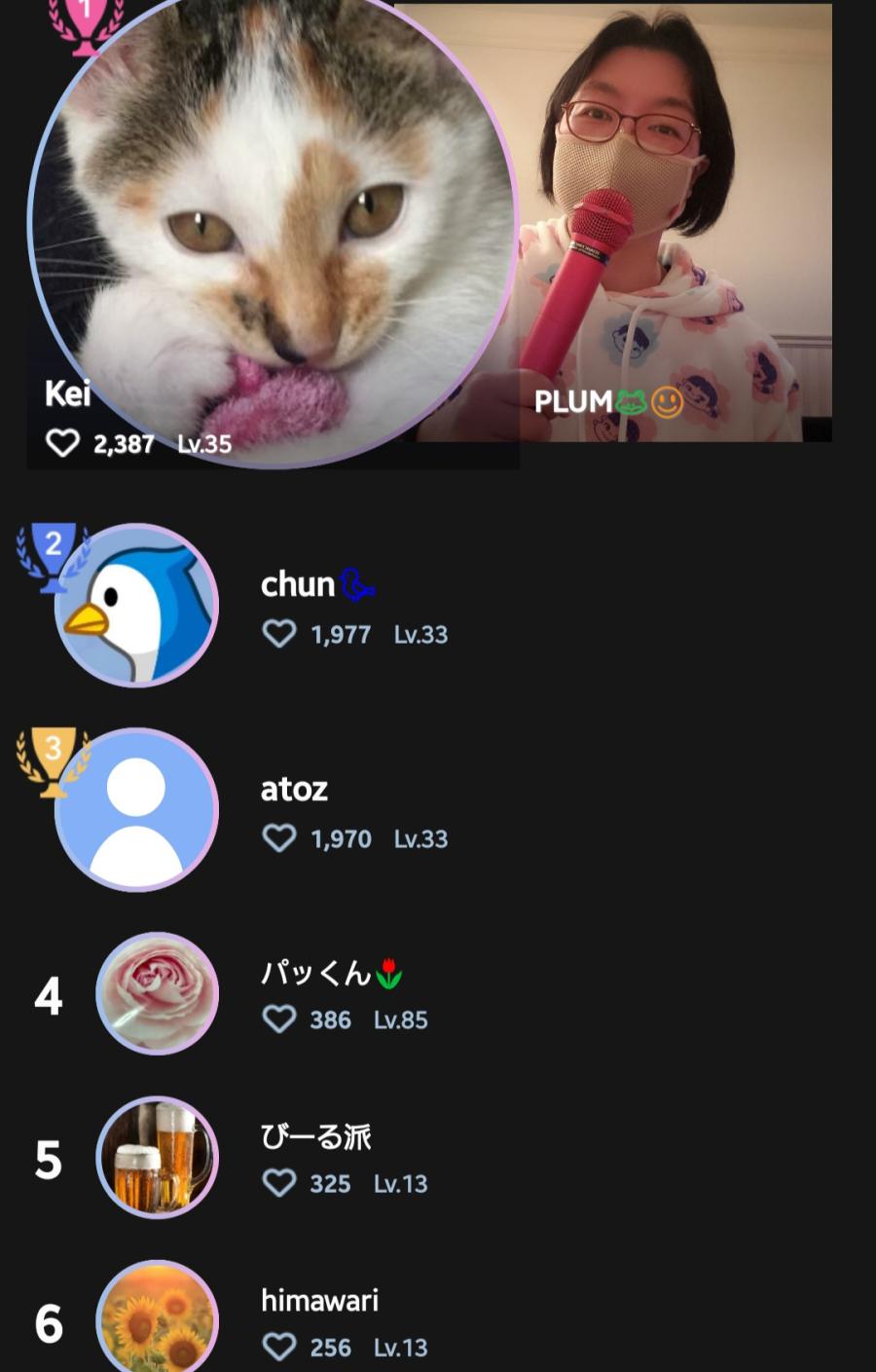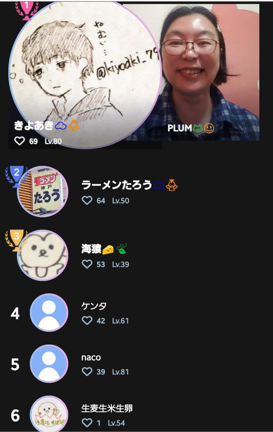お疲れ様です🥰 昨日は配信来てくれてありがとうございました〜‼️🤩 CHEER、コメントも沢山ありがとう、嬉しかったよ❣️🤗 写真は、昨日のファンランキングだよ。感謝です✨😊 話してたら、またチキン食べたくなっちゃった😆🍗🍗🍗 次回の配信は、私の誕生日11日の夜に出来たらいいな ☺️ 間が空いちゃうけど、また遊びに来てね❣️待ってるよ💕︎ 午後も笑顔でね🤗 PLUM🐸☺(2)