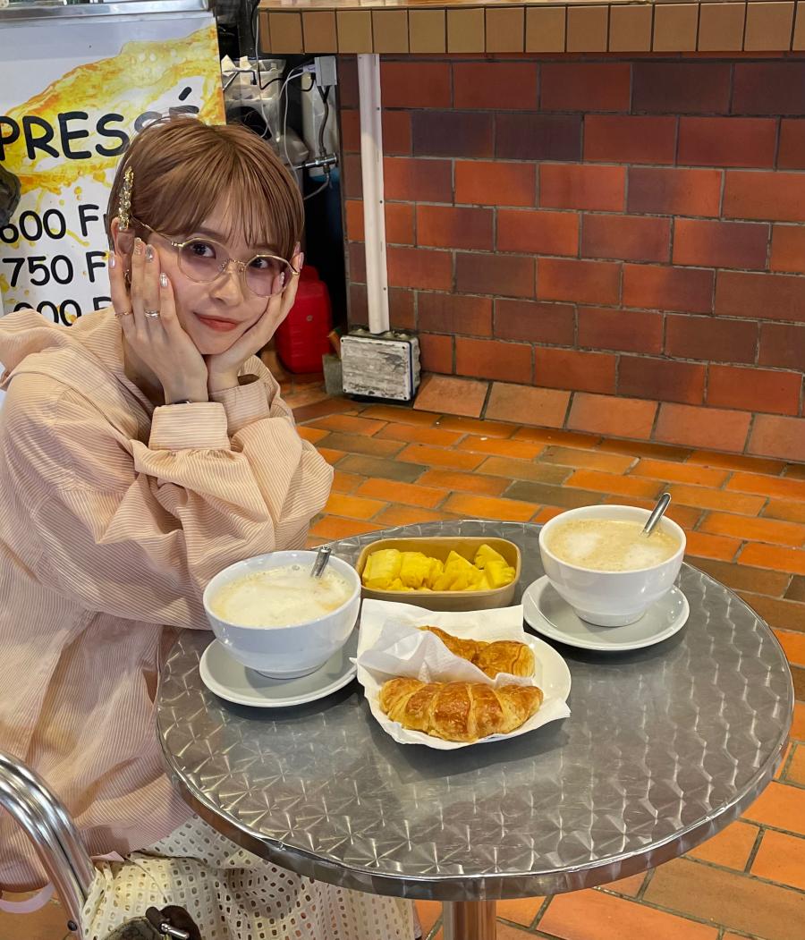 おはよう配信見にきてくれてありがとう🫶 朝早いのにたくさんきてくれて嬉しかった〜! また明日も朝やるけ見にきてね🌷 夜も配信するよ〜📢 この写真はマルシェで朝ごはん🥣 カフェラテでかすぎ😂 コーヒー好きじゃないけど頑張る~☕️(1)