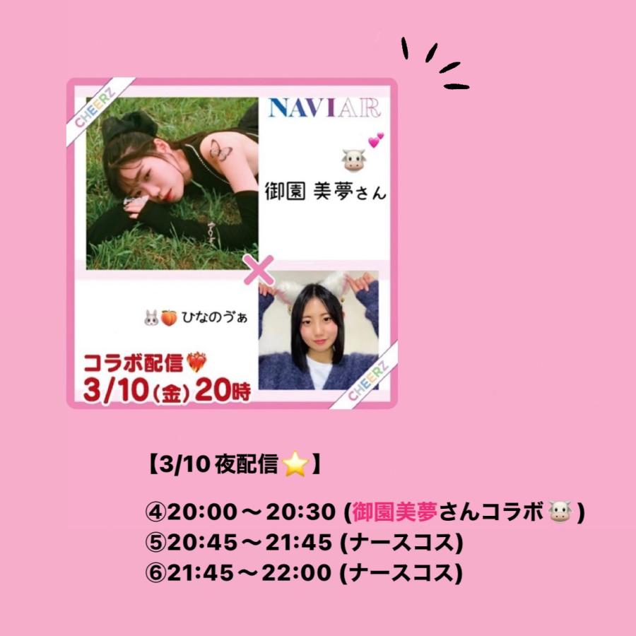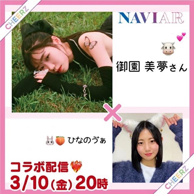 初コラボ❣️御園美夢さん🐮 ✅3月10日(金)20:00〜20:30 なんとこの度、NAVIARのメンバー御園美夢さんとコラボ配信させて頂けることになりました!👏🏻 8人組インフルエンサーガールズユニットNAVIARで活躍されている御園さん🦋一緒にお話しできるなんて嬉しいです🥹♡ 私はコラボ自体初めてなので緊張しますが、楽しい時間を作れたらと思います💞 皆さんよろしくお願いします🙇🏻♀️✨ また御園さんも超十代2023にご出演されるので、私もランウェイに行けたら嬉しいです💪🏻 今回ご縁(2)