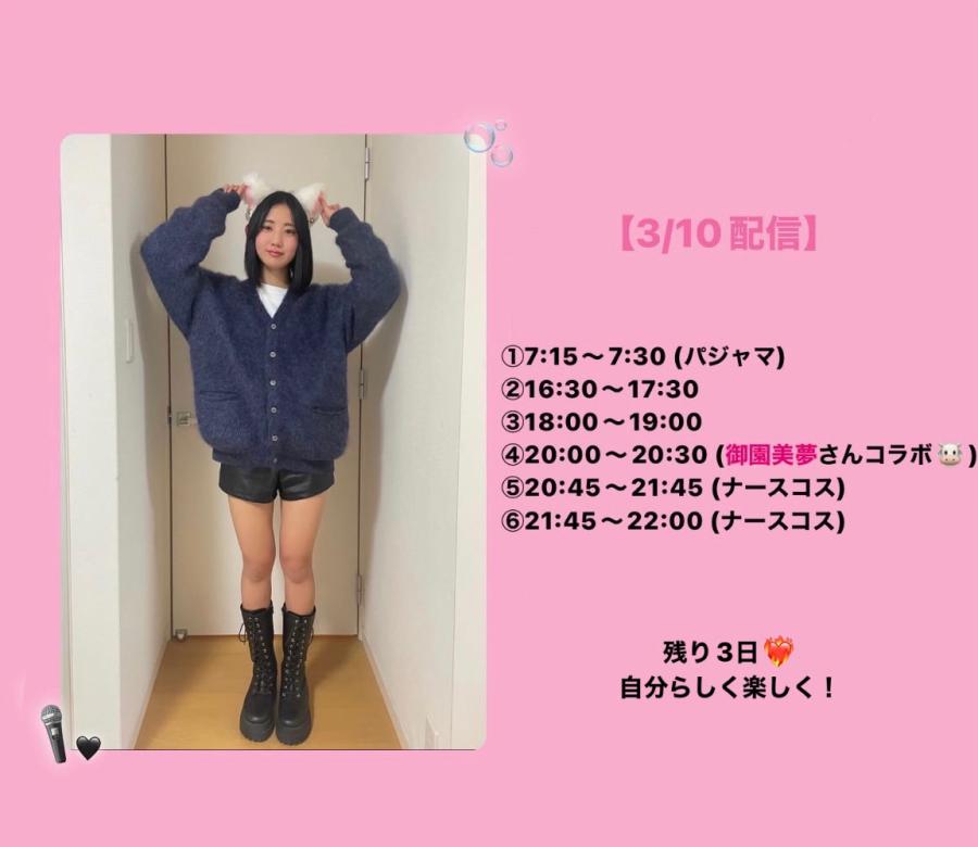 (明日は初コラボ配信!タイテあり⬇️) 今日の配信見にきてくださった方、チアしてくださった方、コメントでお話ししてくれた方、ありがとうございました💜投稿へのチアもありがとうございます!今日も楽しかったです🐰♡ 【3/10配信】 ①7:15〜7:30 (パジャマ) ②16:30〜17:30 ③18:00〜19:00 ④20:00〜20:30 (御園美夢さんコラボ🐮) ⑤20:45〜21:45 (ナースコス) ⑥21:45〜22:00 (ナースコス) 残り3日となりますが、夢のランウェイで歩くた(0)