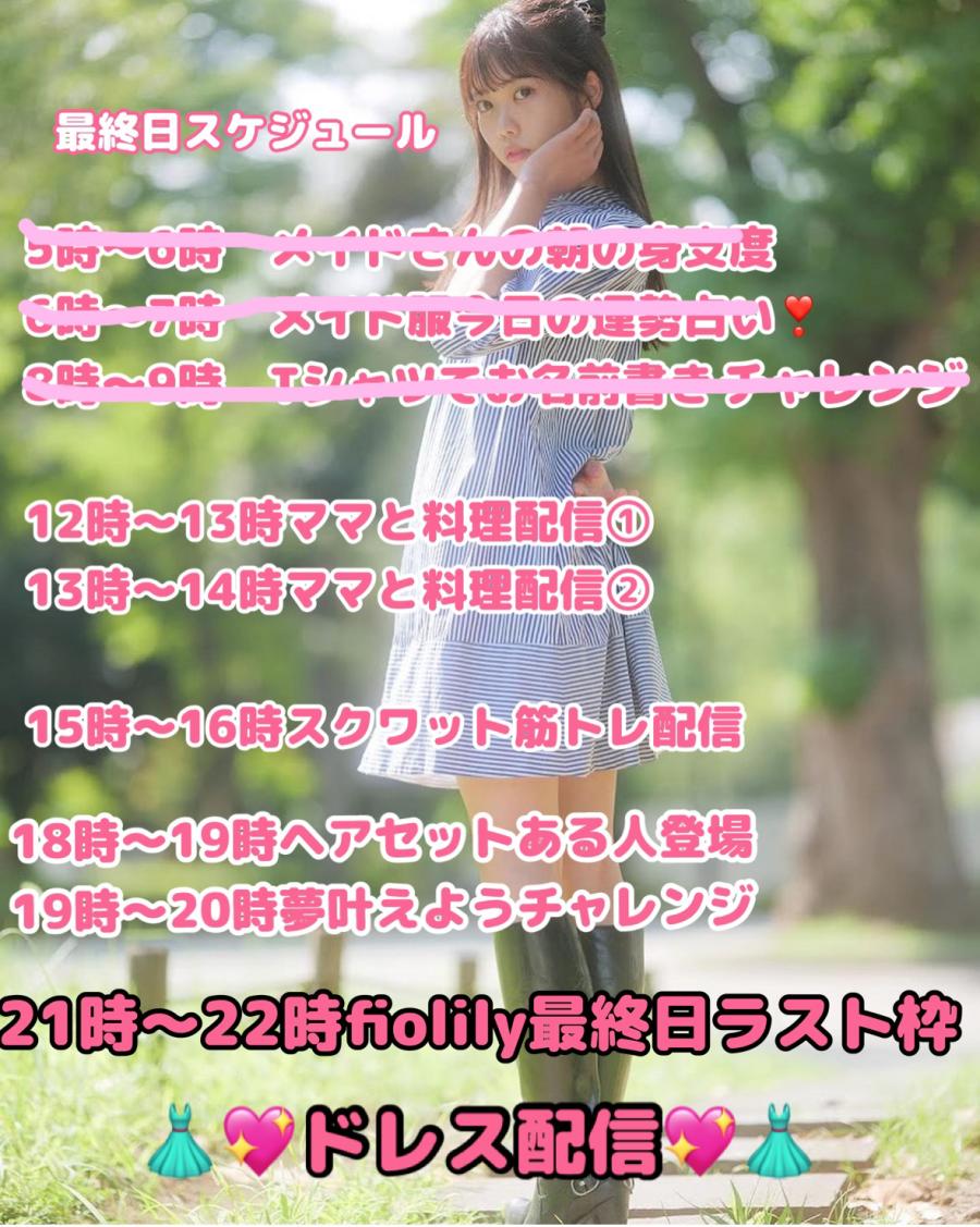 読んでくれると嬉しいです。 皆んな見てくれてありがとう。遂に今日最終日です。舞台が終わってすぐ予選がスタートし、モデルや女優のお仕事をしながらさらに大きな夢に向かって今日まで配信して来ました。 実はイベント配信に参加すると決める時緊張で胸がギュっとなるのですが、自分が1位を獲りfiolilyのPRモデルになって巨大駅広告に載ることを想像したら楽しみで堪らなくなり応募しました。 小さい頃から夢で憧れ続けたモデルのお仕事。 そして、お母さんがコソッと言ってた「ひながこの駅の大きい広告載るの見たい」そ(7)