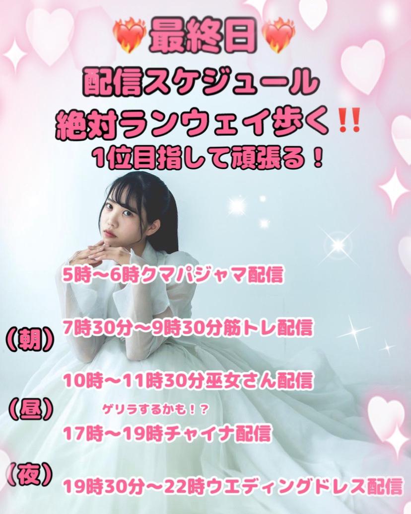 ❤️🔥最終日タイムスケジュール❤️🔥 (朝)5時〜6時クマパジャマ🧡 7時30分〜9時30分筋トレ配信💛 10時〜11時30分巫女さん💜 (昼)ゲリラするかも⁉️ (夜)17時〜19時チャイナ❤️ 19時30分〜22時ウエディングドレス🤍 配信出来ない時は投稿にチアチアしてくれると本当に嬉しいです🥹💖 皆んな明日がラスト絶対1位取ってランウェイ歩こう❤️🔥 最後まで全力で頑張るので応援お願いします❗️ 最後の力を貸してください🙇♀️ 大好きだよ!(0)