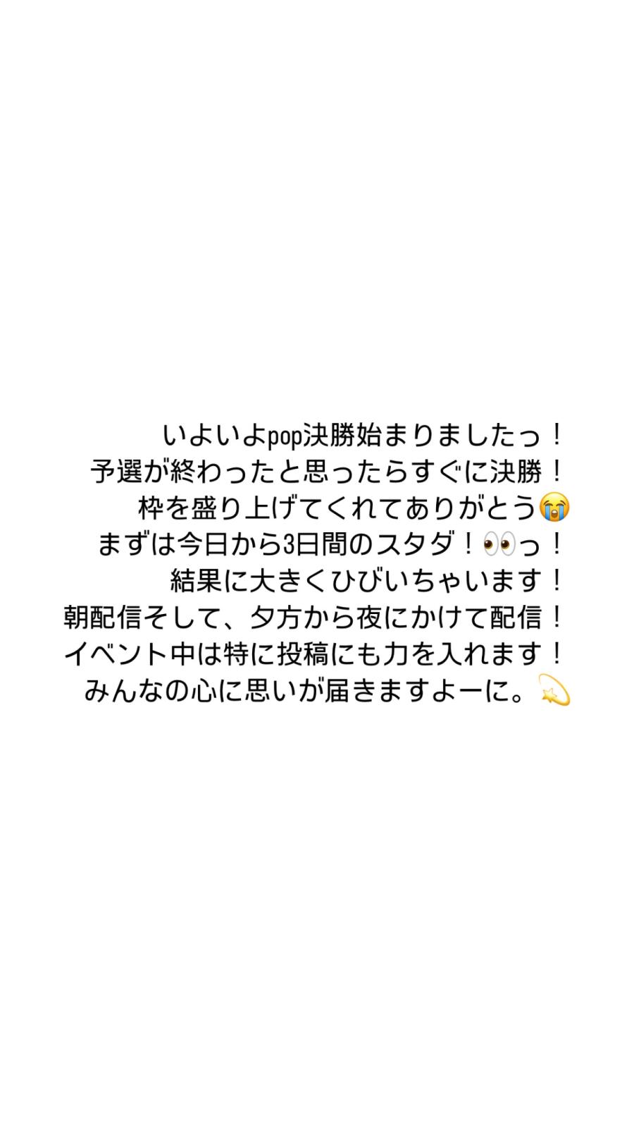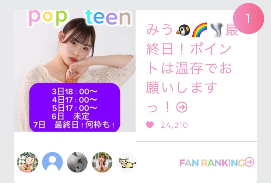 1位本当にありがとう😭😊😭 感謝しか言葉が出ないです。、、 無事に決勝に進むことができましたっ!💗 決勝は9日18時〜14日21時59分までっ! スタダは11日21時59分までっ! pop teenのランウェイ絶対に絶対に歩きたいっ! 明日は朝5時〜7時と学校から帰ってきて配信しますっ! 『重要!』ポイントは温存でお願いしますっ!! 決勝は絶対に1位で終わりたい! みうにとって2位は9位とおんなじ! 絶対に絶対に1位をとる! みなさんのお力を貸してほしいです!!!!!!!!!!!!!!!!!(1)