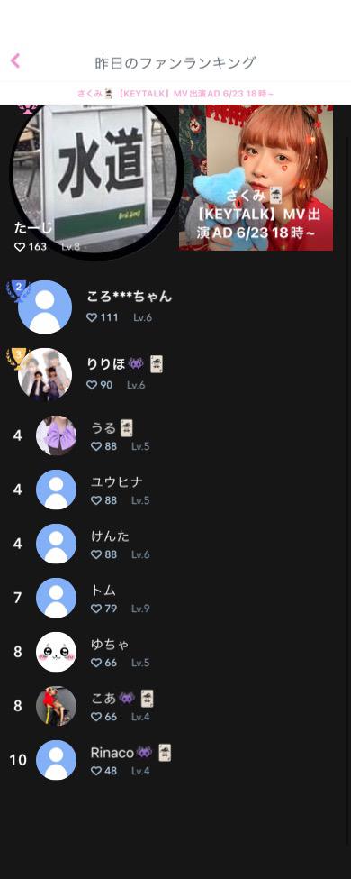 早速ちあちあありがとう⸝⸝o̴̶̷̥᷅ ̫ o̴̶̷̥᷅⸝⸝♥️ ランキングが見れるみたいなので 毎日載せていこうかな!!! 🥇たーじ❤️🔥 🥈ころ* * *ちゃん💙 🥉りりほ🤍 みんなにLvがかいてあって ポケモンたちみたいでかわいい💭 goodnight🌙(2)