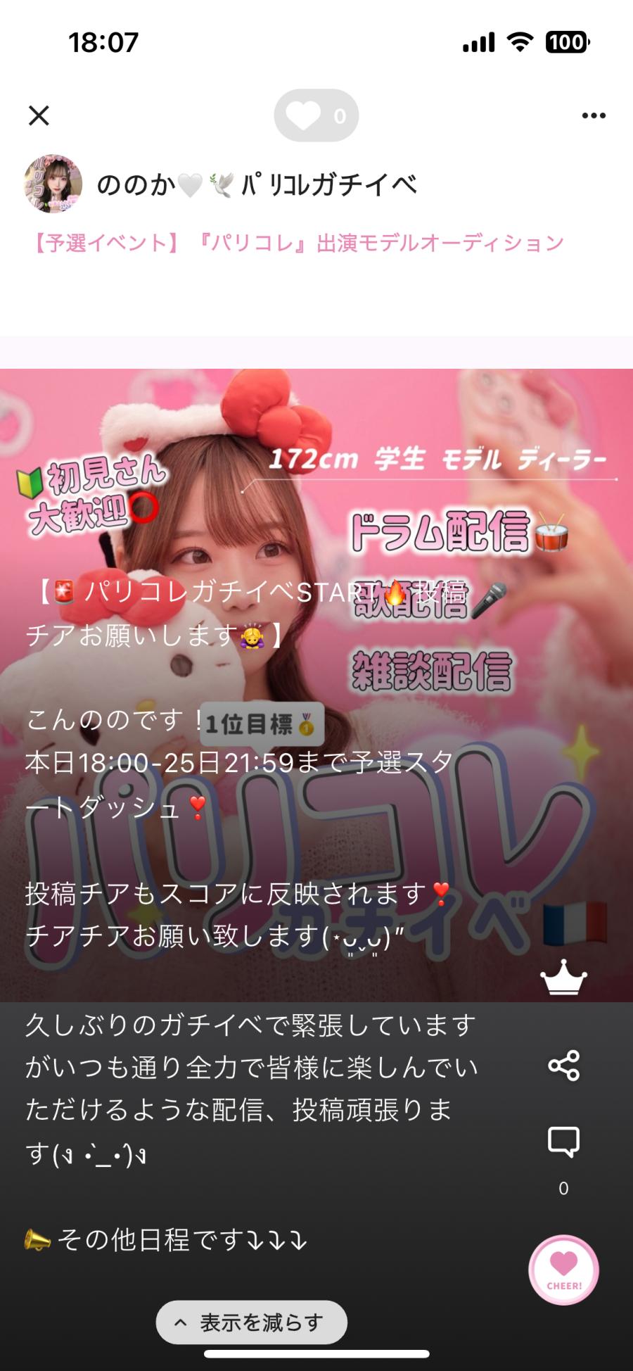 《新CHEERZアカウント消えちゃった💦こんののです🙇🏻♀️´-パリコレ応援ありがとうございました。》 新CHEERZアカウント消えてしまって遅くなってごめんなさい💦 予選期間の応援ありがとうございました🥲🎀 体調が優れなくて長く配信出来なくてごめんなさい🙇🏻♀️💦そんな中応援ありがとうございました☺️ らぶちの皆さん大好きですっ🫶 これからガチイベ参戦はしない予定だけどその代わり皆さんと直接会える機会作りたいなって思ってます‼️ お知らせがある時は配信も時々すると思う(2)