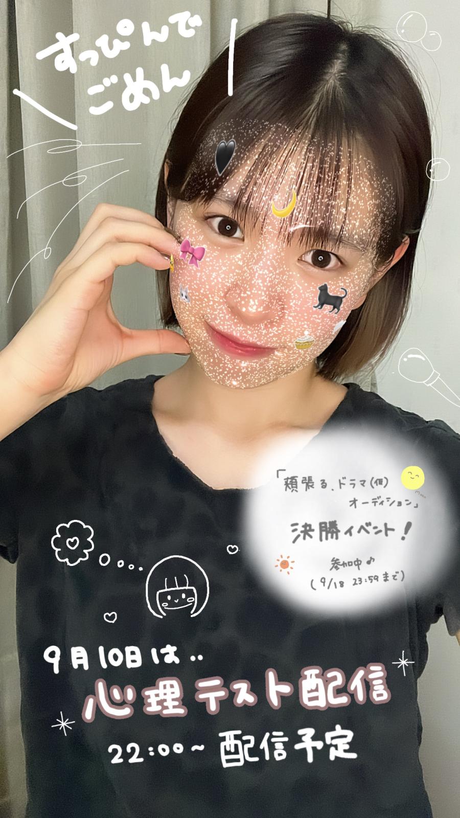 こんばんは!! 「頬張る、ドラマ(仮)オーディション」 決勝イベントが始まりました😭😭✨ みんなのおかげで進むことができた決勝… ほんまにほんまにありがとうです。 決勝進むからには、 みんなと楽しみたいです🙇♂️ 今日は前から決まってた予定があって、 スタートダッシュ遅れちゃうんですけど… 夜中配信しますので∩(*´`∩)♡ 配信のスケジュール(服装とか?)、 内容とかも相談させてください🥲💭 あと化粧したら化粧品で肌荒れしました笑 すっぴんで配信してるかも… 肌加工(0)