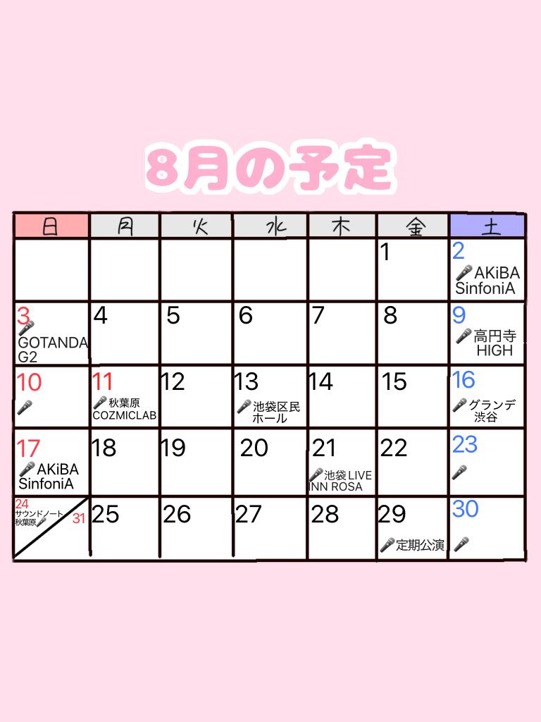 8月の予定、確定したイベント書き足したよ!参考にしてぜひ会いに来てね🩷 次のライブ👇🏻 9日(土)高円寺HIGH https://ticketdive.com/event/KEJS_002(1)