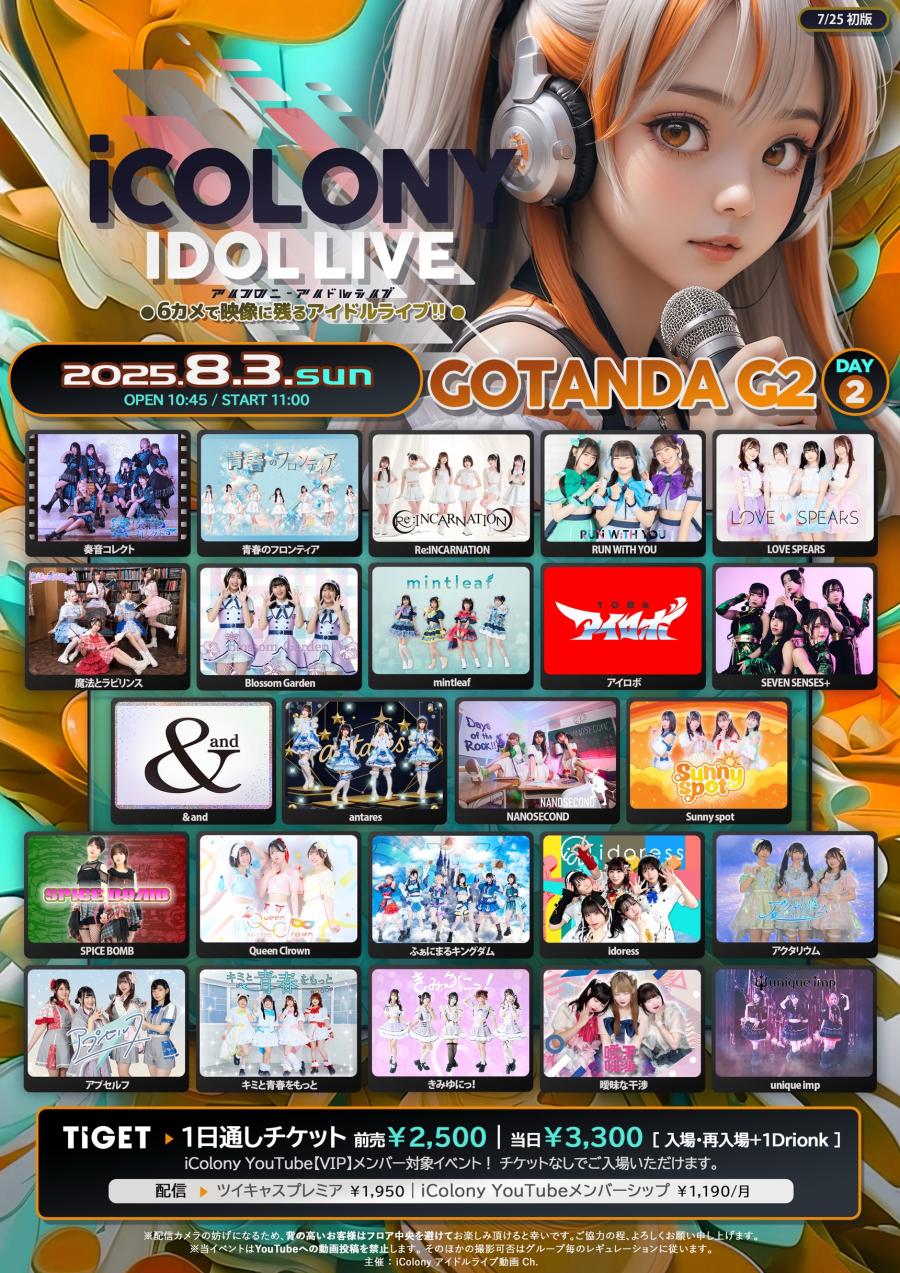 8/3(日)のライブ詳細!初箱!初アイコロニー!見に来てくれると嬉しいな! 出演 16:30~16:45 物販 16:50~17:50 ◤ICOLONY IDOL LIVE 92 // DAY2◢ 8/3(日) @ GOTANDA G2 OP10:20|ST10:35 🎫TICKET https://tiget.net/events/417925 前売¥2,500|当日¥3,300|入場再入場+1D 📺ツイキャス¥1,950 https://twitcasting.tv/c:icolony/(1)
