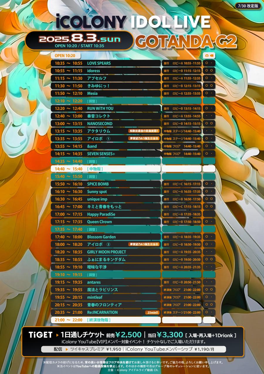 明日のタイテです!初アイコロニーさんです!ユニプ16:30~です。 たくさん集まってくれると嬉しいです🙏🏻🩷よろしくお願いします🙇🏻♀️ ◤ICOLONY IDOL LIVE 92 // DAY2◢ 8/3(日) @ GOTANDA G2 OP10:20|ST10:35 🎫TICKET https://tiget.net/events/417925 前売¥2,500|当日¥3,300|入場再入場+1D 📺ツイキャス¥1,950 https://twitcasting.tv/c:icolon(1)