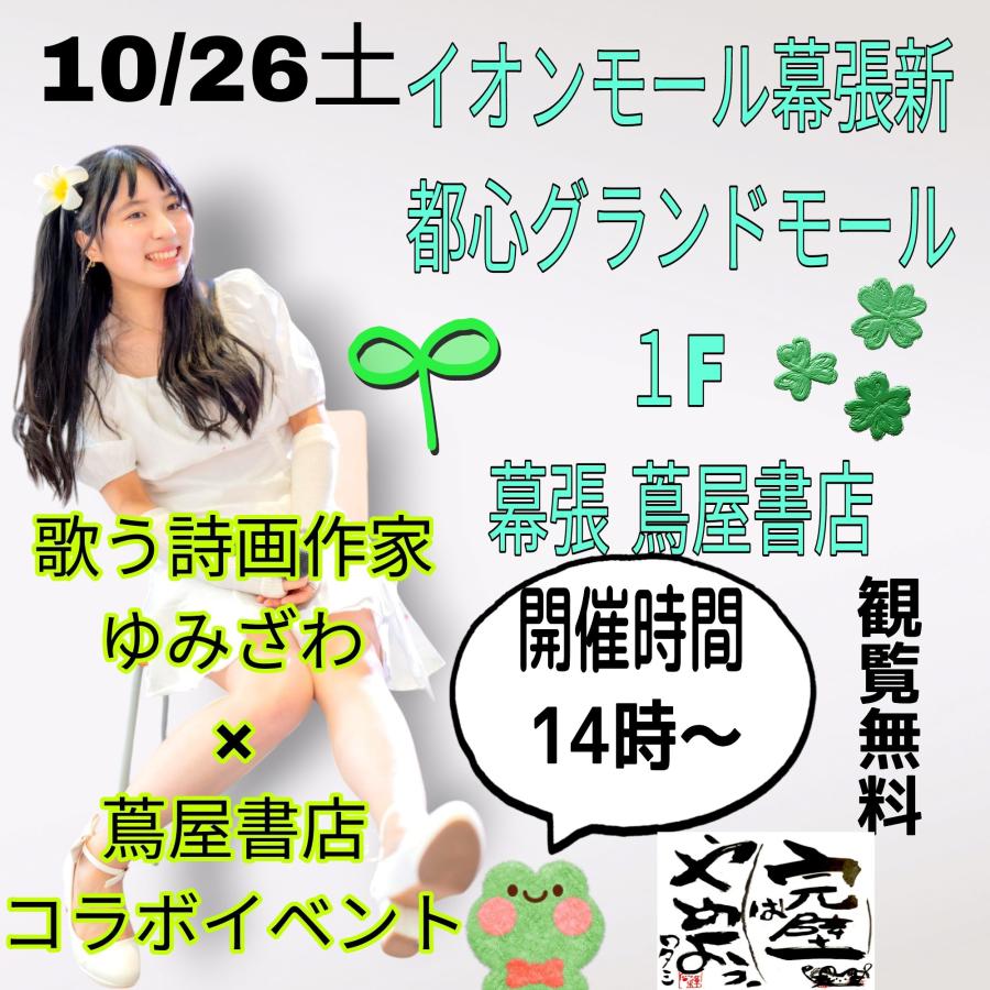 いよいよ明日! 10/26(土)14時〜 観覧無料! 18歳歌う詩画作家ゆみざわ🎸歌と詩画の世界へご招待いたします🌏 千葉県イオンモール幕張新都心グランドモール 1F 幕涱蔦屋書店 一緒に🍁芸術の秋を楽しみましょう❢❢グッズに関しましては詩画作家イベント限定となっておりますので、是非イベントの記念にお買い求め下さいませ\(^o^)天然木札にゆみざわがあなただけに描き尽くします。2ショットチェキ、2ショット お写真のご用意もございます(0)