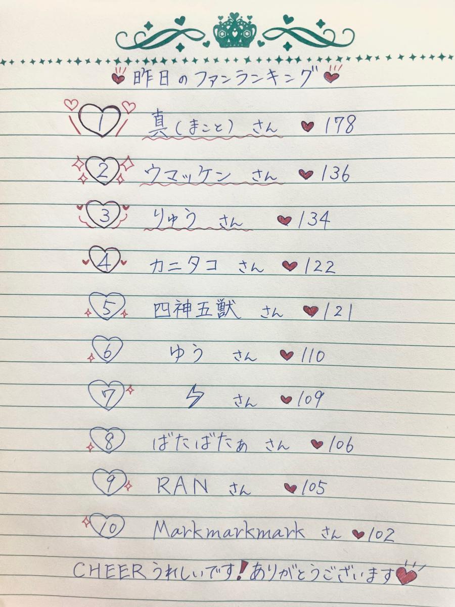 【6/15(土)配信予定🈁】 お昼配信あり❗️♡ \ 12:00~12:30 22:00~22:30 23:50~0:20/ の3枠になります!🎀 ガチイベ残り2日!がんばっていくので、皆さん応援よろしくお願いします💗 ✨️投稿へのCHEERもとっても嬉しいです!!✨️ 「昨日のファンランキング」です🪽 たくさんのCHEERとっても力になります。 本当に嬉しいです😭💗 あと2日ぜひCHEERで応援お願いします❣️ また明日もお待ちしてます⋈*。゚ おやすみなさい🌙(0)