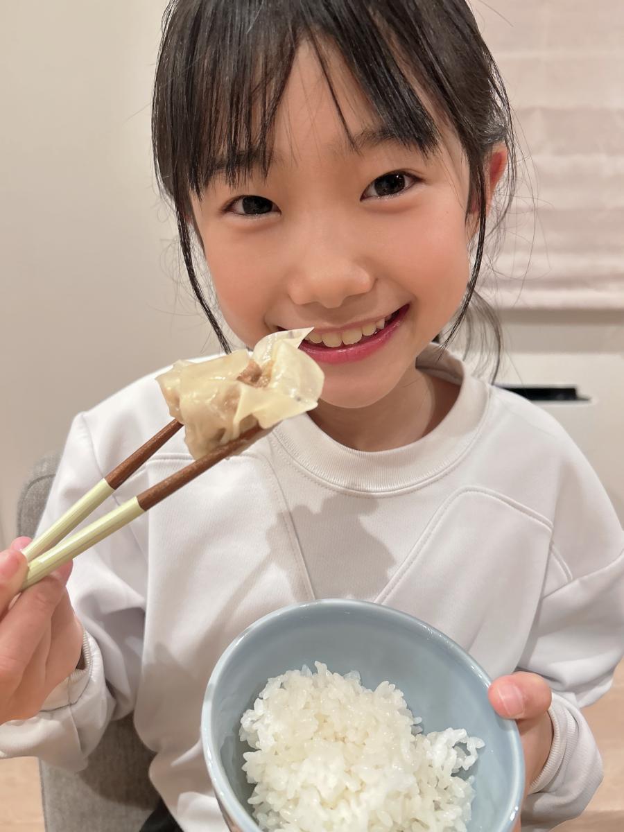 こんばん🌱 今日はママと一緒にしゅうまい作ったよ✨ふーちゃんなかなか皮がうまくはがせなかったの〜😭 ふーちゃんが包んだしゅうまいを焼くと‥(4)