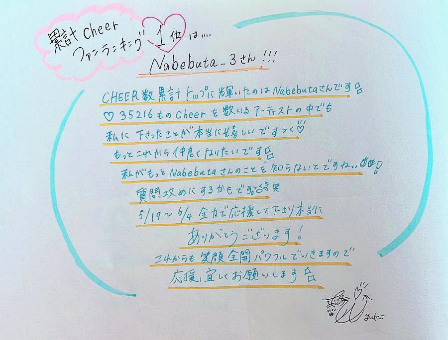 🌟累計cheer数1位🌟に輝いたのは..........⁉️⁉️! ドゥルルルルルルルル..............トゥン!!!! 1位に輝いたのは 【nabebuta_3】さんです✨🥇🏆🏅👏👏👏👏👏👏👏👏👏👏👏👏👏👏👏👏👏👏 🙌🏻🌈🤩🌈🙌🏻😍 🙌🏻🌈🤩🌈🙌🏻😍 🙌🏻🌈🤩🌈🙌🏻 おめでとうございます~!!!!🎊㊗️🎉🍾😆🔥💫 気持ちを込めてお手紙書かせていただきました📮‼︎ うへへへ喜んでくれたらいいな😊 ところで、投稿をみてくれてたりsnsも見てくれている方は、 "ありがとう"って何回(3