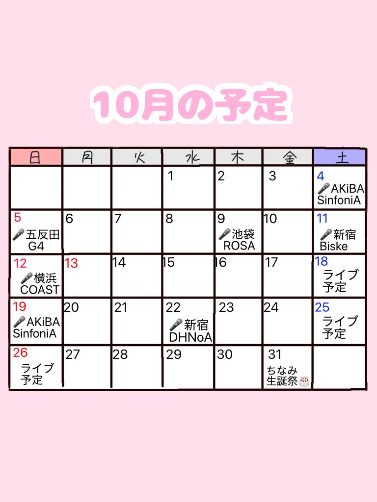 10月の予定です🩷31日ちなみ生誕祭は絶対にぜーったいにみんな来るんだよ!!生誕衣装とハロウィン衣装着るから見に来て欲しいな🎂🎃🦇🕸 今月は撮影会無くて、代わりに11/1と11/30の2回個撮を開催する予定です📸(0