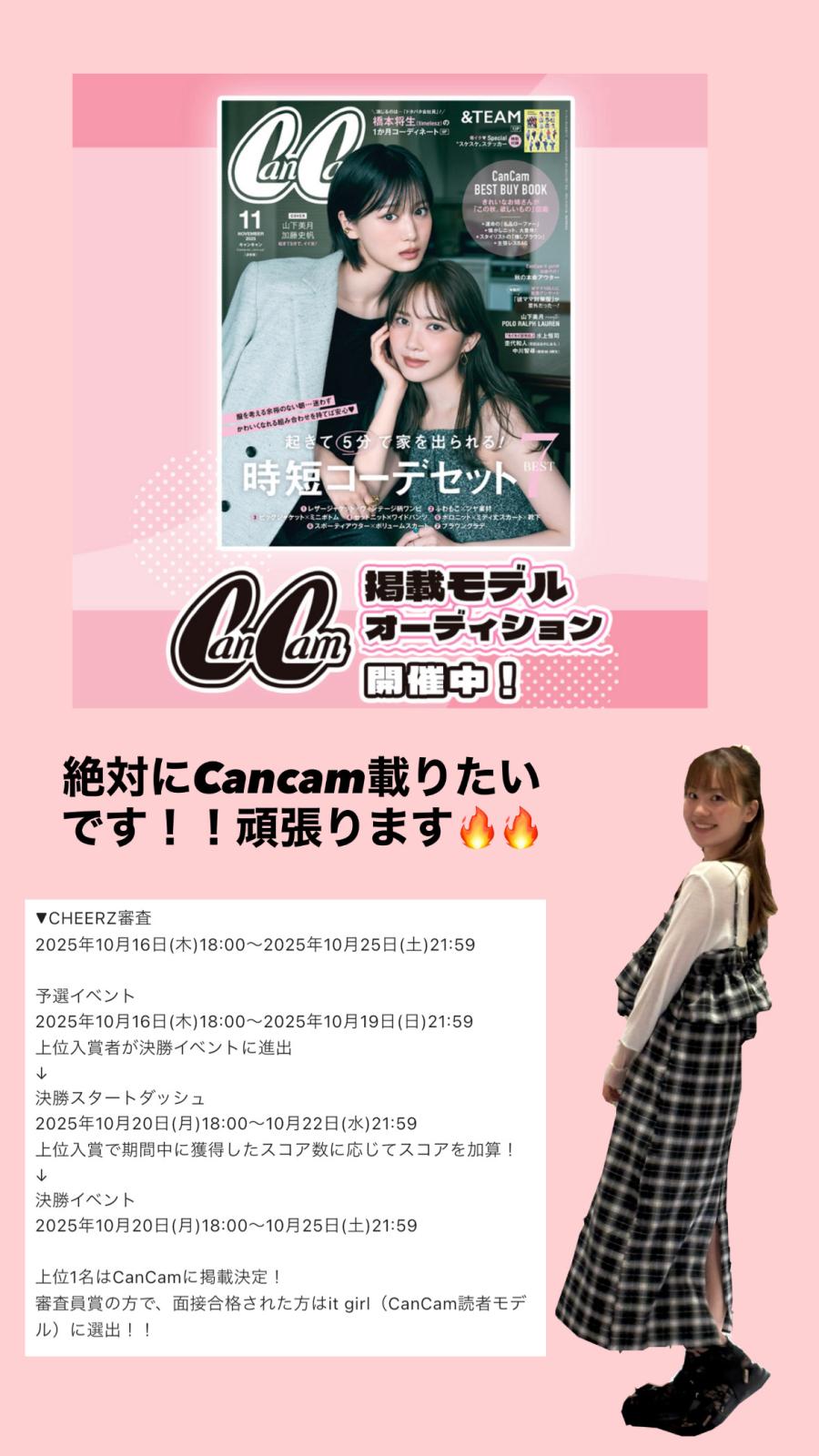 皆さんこんばんは!!旧チアーズでの投稿お久しぶりです(*^^*) お知らせです〜明日から新Cheerzでガチイベ出ます♡♡ Cancam掲載モデルオーディション出ます!ほんとに私が大好きな雑誌です💕︎ 10/16 18:00〜です!! 少しバイトの為、遅れてのスタートになってしまうのですが、ミニストップ以来のガチイベ全力で頑張ります!!バイト爆速で帰って配信と投稿します! ぜひ応援よろしくお願いします✨(0
