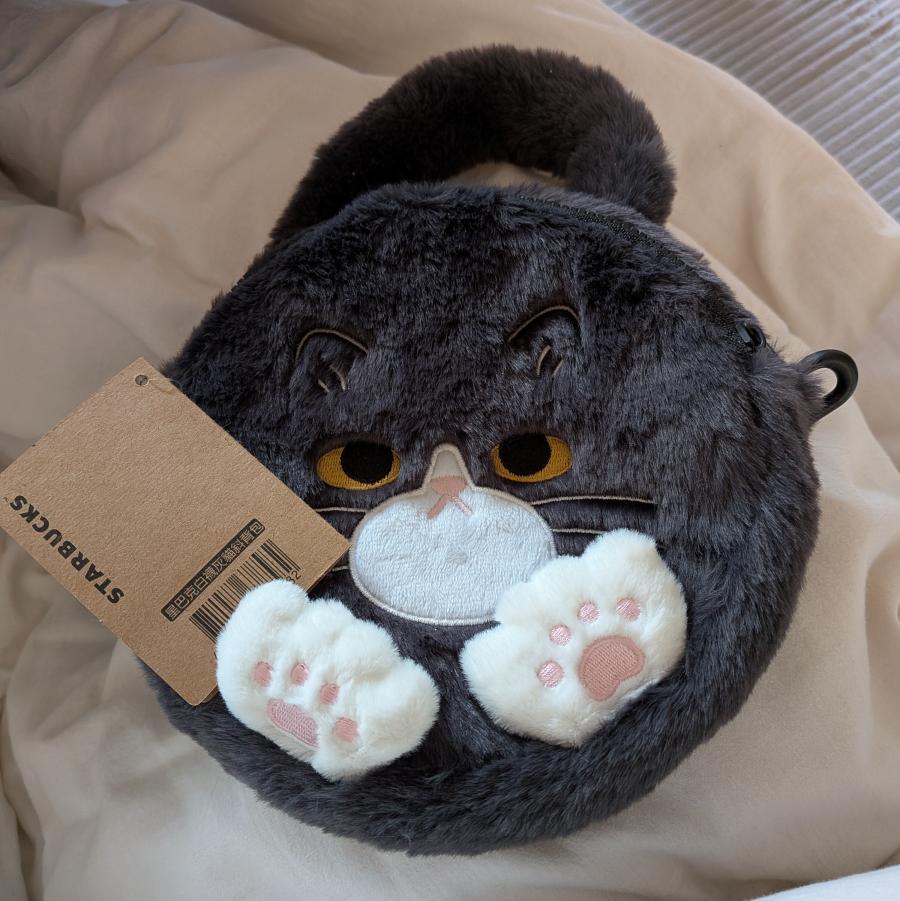 『海外スターバックスの黒猫2Wayショルダーバッグ👜🐈‍⬛代行で購入しました😊こういう感じのなかなか日本に売ってなくて😥このジト目なのにもふもふで手が肉球見えるのがたまらん🤤🩷海外スタバは結構可愛いの多いので別で貯金してまた購入出来たら良いな✨️ちなみに使用するのはお正月です✨』(0